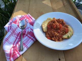 The buttermilk biscuits make 8, however, since it's just my husband and I, I had these biscuits in the freezer and just had to defrost them. The sloppy joe recipe is flavorful. First of all, it's made with ground turkey but also has chopped onion, celery, bell pepper and garlic. To further enhance the mixture, crushed tomatoes, which I prefer over whole tomatoes, there is some ketchup, molasses, cider vinegar and Worcestershire sauce to charge up the flavor profile.