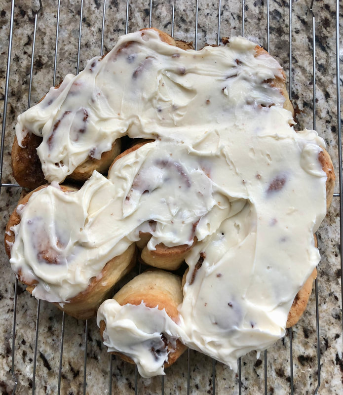 The dough was very easy to prepare. I used a ruler to get the dough the proper size and rolled it tightly to seal in the filling. The rolls are baked in a cake pan which is lightly greased (I use butter wrappers that I save). The rolls bake in 20 to 25 minutes. I removed my already made frosting from the refrigerator to soften, but added a bit of heavy cream to make it the proper consistency for spreading. Oh, my goodness, were these ever so good! My husband couldn’t wait to try one! The rolls were tender, had just enough sweetness and the cream cheese frosting made these rolls over the top. There is only so much indulging my husband and I can do, so I shared them with our neighbor who said, “Your cinnamon buns were so good! Finished them up today with tea! Delicious! Thanks so much!!”