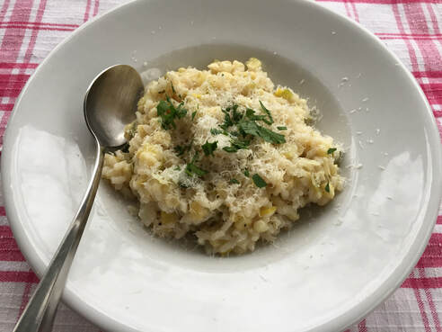 The risotto had one sautéed leek, a bit of wine added at the beginning of cooking the rice, and of course, 1-1/2 cups of corn (approximately from 2 ears). When half of the cooking stock was incorporated into the rice, this is when the corn is added to the risotto.