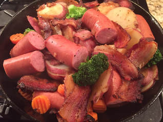Fry the bacon until crisp. Once the bacon is cooked, remove and sauté the onions in the fat. Toss in the potatoes, season with a bit of pepper and sauté until slightly golden. Add the package of mixed vegetables and water. Place kielbasa on top of the vegetables, season again with a little pepper, stir to combine ingredients then top with bacon.  Cover the pan and steam on low heat for approximately