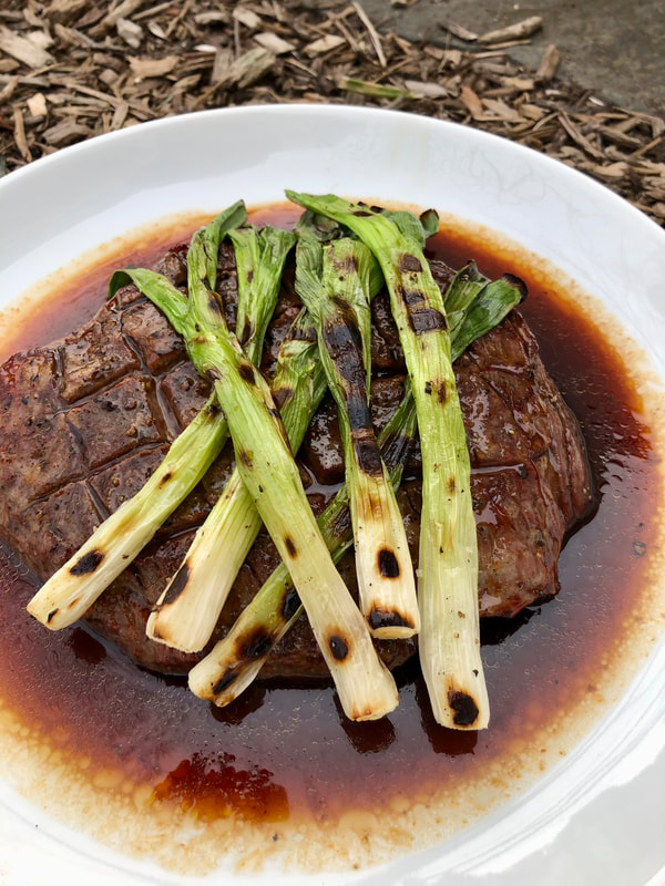 This recipe uses a reverse marinade, the cooked meat has the marinade poured over it and rests in the sauce for 15 minutes to absorb the flavors. The marinade is made of mirin, soy sauce, brown sugar, vinegar, Sriracha and sesame oil. The scallions are tossed with olive oil, seasoned with salt and pepper and grilled prior to the meat until charred and tender.