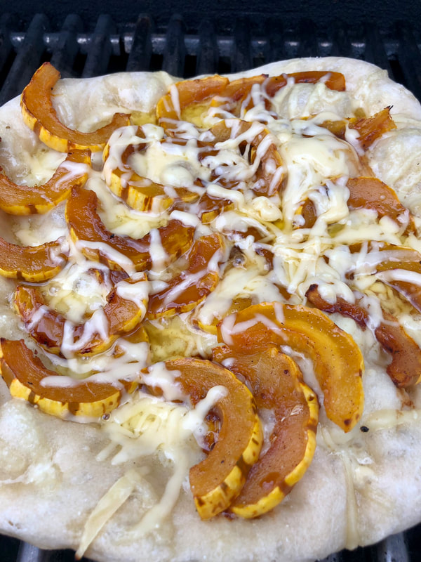PS- I made the pizza by layering shredded gruyere cheese as a base, topped with brown sugar Delicata squash and finished with shredded Gouda that I place on top the pizza a few minutes before removing from the grill just to melt the cheese. I cook my pizza outside on my Weber grill.
