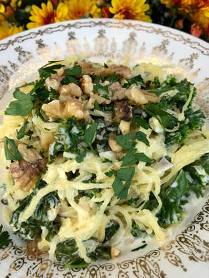 When the squash was done, I scraped the inside to form strands then added it to my cream mixture. I made sure to incorporate enough sauce to our liking before mixing in the cooked kale. To serve, top with toasted chop walnuts and chopped parsley.