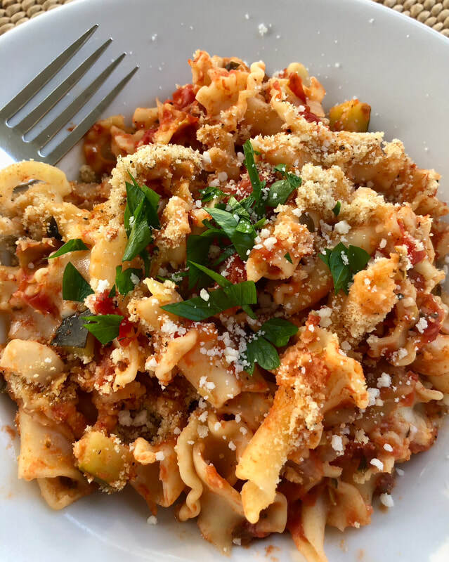 Recently in my CSA box, I had a green zucchini, two yellow squashes and an eggplant. With company here, I tucked them in my vegetable crisper and almost forgot about them. To use them up, I dug out my recipe for Eggplant and Macaroni Casserole. I swapped the yellow squash for a green pepper called for in the recipe. From my herb garden, I used fresh parsley, oregano and thyme. Instead of baking it in the oven, I cooked each person’s dish covered in a microwave for several minutes to heat through…delicious! The pasta was moist and the diced pieces of provolone cheese melted nicely. As my husband and I were only going to eat a small portion of the pasta, I was able to save the unbaked balance for another night’s supper.