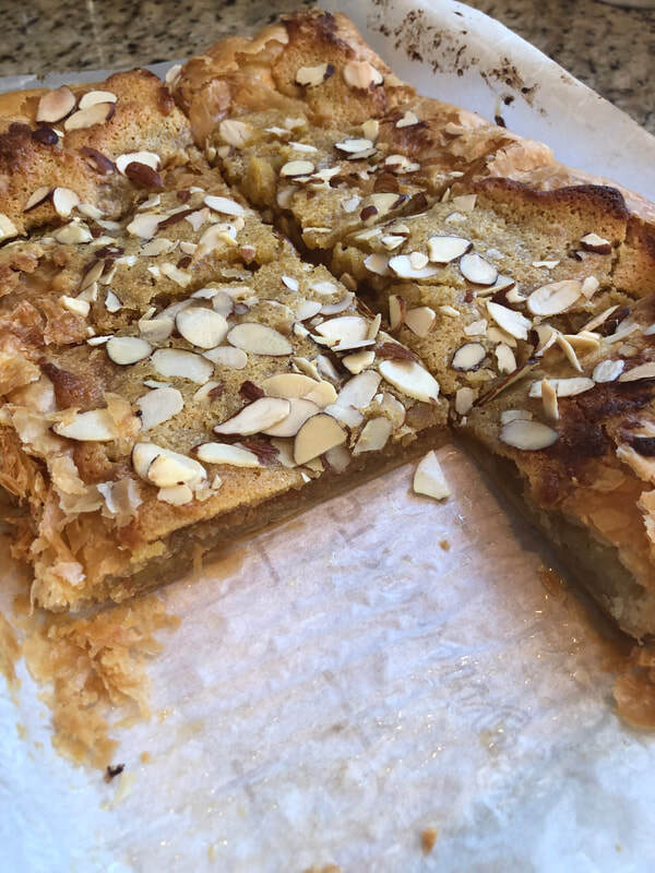 After the dough is baked to a deep golden brown. To aide in slicing horizontally, I laid the handle of my knife on the rimmed sides and used that as my guide.  You must be extremely gentle as you slice as not to crack the pastry top. After I removed the top, I gently brushed the leftover simple syrup on to the inside of the pastry. This was not part of Ms. El-Wally’s recipe. Next I placed dollops of frangipane on the bottom of the pastry and ever so delicately spread the filling to the edges. Lastly, the top half of the pastry is placed over the bottom and the remaining frangipane is spread delicately over the top. A sprinkle of sliced almonds completes the croissant.
