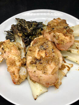 Thank goodness there are some many one pan|skillet|pan meal recipes available these days. Today I prepared another New York Times Cooking recipe for Sheet-Pan Scallion Chicken with Bok Choy. This tangy recipe has you prepare a coating of mustard, miso (I substituted soy sauce), scallions, garlic and ginger that is spread over the chicken before cooking. For the recipe you’ll also need brown sugar or turbinado, salt and pepper, safflower or canola oil, bone-in and skin-on chicken thighs. I used boneless, skinless chicken breasts in place of the thighs.