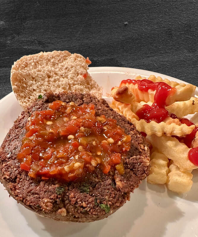 When I was shopping earlier in the day, I picked up a package of dinner rolls for the burgers. You may notice in the image above, the top of the roll is a bit smaller than the burger. To serve, I topped the burgers with some hot chopped pepper relish. The burgers were very tasty. I used smoked paprika which gave the burgers a hint of smokiness and sweetness. The soy sauce and porcini mushrooms added a savory note and umami. Overall, tasty and quite filling I might add.