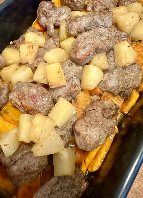 The sweet potatoes get started first in a hot 425° oven for 15 minutes. While they roast, the pork tenderloin slices are sautéed in a skillet with oil, then removed to a bowl. A can of pineapple chunks are added to the skillet and the fond scrapped off the bottom. This mixture, the pork and reserved marinated are added to the roasting potatoes and baked for another 20-30 minutes or until vegetables are tender and the pork is no longer pink.