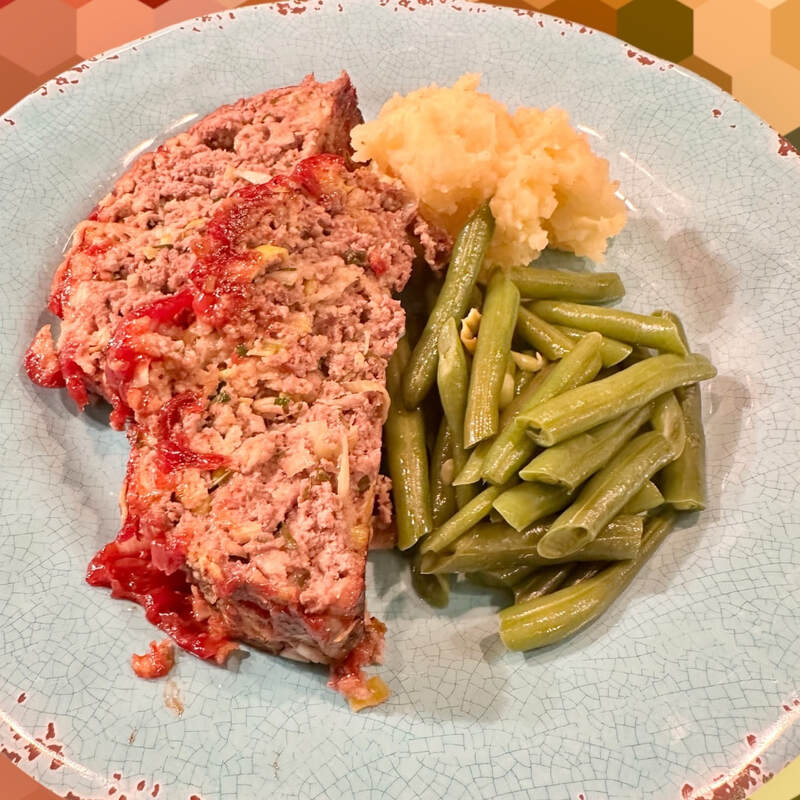 Problem number one, I didn’t have seasoned breadcrumbs so I used plain. Secondly, it wasn’t ground turkey that I defrosted, but ground beef. What the heck, I decided to follow the recipe using the beef and added Italian seasoning. All the ingredients were mixed into the meat then shaped into a loaf on a parchment lined rimmed baking sheet. The ingredients for the sauce were mixed in a small bowl and poured on top. The meatloaf bakes approximately 45 to 55 minutes or until it reaches  160°F.