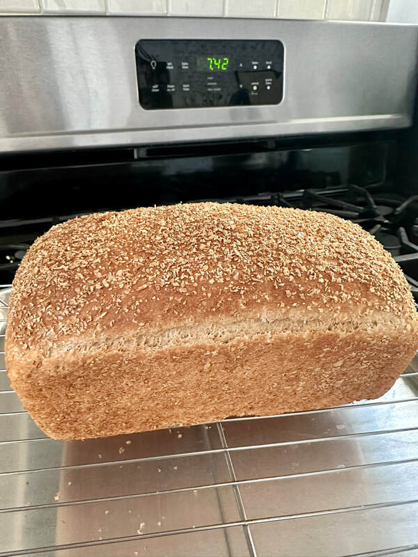 After the second rise, the dough was placed back on the wood board, deflated and patted into an 8 x 12-inch rectangle. To have a uniform shape, you’re instructed to fold one short edged to the middle and pat down. Bring the other side over, slightly overlap the other and pat down. The dough is then flattened to a uniform thickness then rolled into a log, seam pinched and if desired, the ends may be pinched too. Before placing the bread into a greased loaf pan, the bread can be coated with wheat germ. Using a baking sheet, wet a towel and wring it out, but it should be damp to touch. In another sheet pan, place 1/4 cup of wheat bran or germ in an even layer. Place the top of the bread dough on the damp towel so the dough gets tacky then roll in the wheat germ. The dough goes into the loaf pan to rise for another 1-1/2 to 2 hours. Into a preheated 350° oven, the bread bakes for 35 to 40 minutes, or until the internal temperature reaches 190°F.