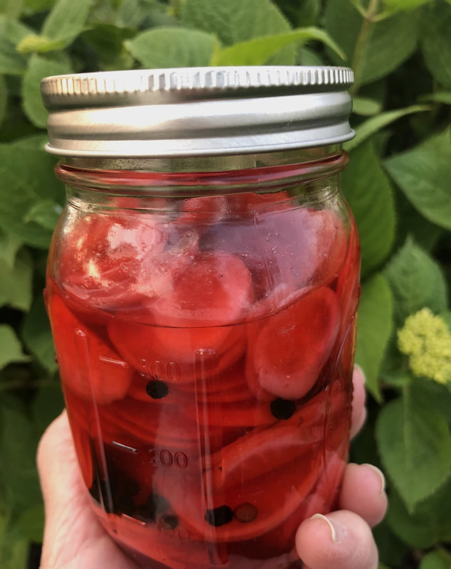 The preparation is very easy; it helps if you have a mandoline. I like my OXO Simple Mandoline, it’s easy to use and cleans up wonderfully. The mandoline makes sure each slice of radish is the same thickness. I used it to slice off the bottoms and tops of the radish then made thin rounds. I put the radish slices in a pint mason jar. The brine consists of vinegar, water, honey (my choice), salt and approximately 1/2 to 3/4 teaspoon of black peppercorns. The mixture is brought to a boil then poured over the radishes.