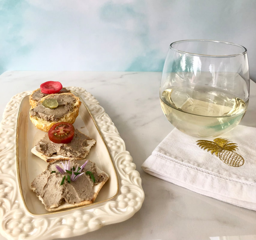 Next comes the carrier for the mousse. Alexian sells their own crackers with flavors such as Olive Oil & Sea Salt, Rosemary & Olive Oil and Cracked Peppercorn. For one serving idea I used their Olive Oil & Sea Salt; the other I made little pâte à choux puffs. I removed a portion of the spread from the package and stirred with a fork until the mousse until it was softer and easier to spread. The mousse was spread on the crackers and on each of the puffs. For garnish, I used sliced cornichons, minced chives and chive blossoms, sliced petite heirloom tomatoes and my pickled radishes.