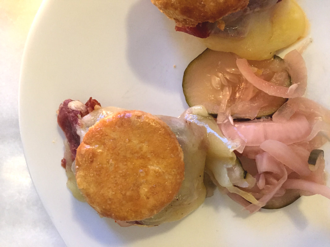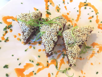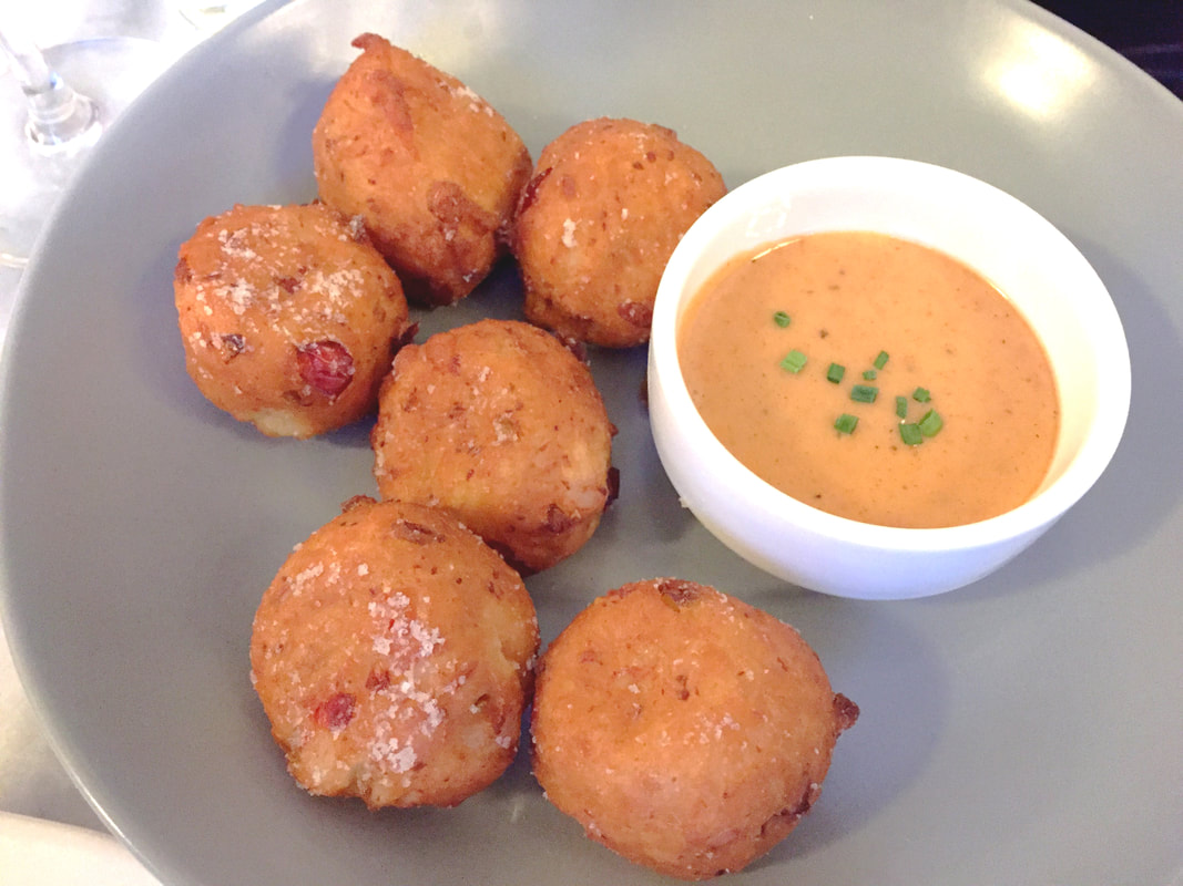 We selected Col. Newsom's Country Ham Biscuit Sliders (4 per order). The ham was topped with a slice of Cabot cheddar cheese and a sweet and spicy pepper jelly ($8). We also tried the shrimp toasts (4) that had a combination of Szechuan spice and scallions ($9) and local diver scallop hush puppies (6) accompanied by a Comeback sauce ($11). All of these dishes were delicious. The country ham is a bit saltier and drier in texture than the ham we're all more familiar with. The Shrimp toasts were delightful, a bit spicy and served hot. The scallop hush puppies were light as air and the Comeback added another layer of flavor and bit of heat. The Comeback sauce reminded me of a kicked up version of remoulade sauce.