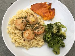 What an awful morning it was today. Despite the downpour this morning, grocery shopping had to be done. While checking off the items on my Wegmans’ shopping app, I was trying to figure out supper for tonight. My initial plan was to prepare a pasta casserole, but then saw Wegmans reduced the price of scallops. The fishmonger said that over the weekend and today, scallops had a special price of $14.99/lb., down from a high of $18.99/lb. I couldn’t resist this impulse purchase.
