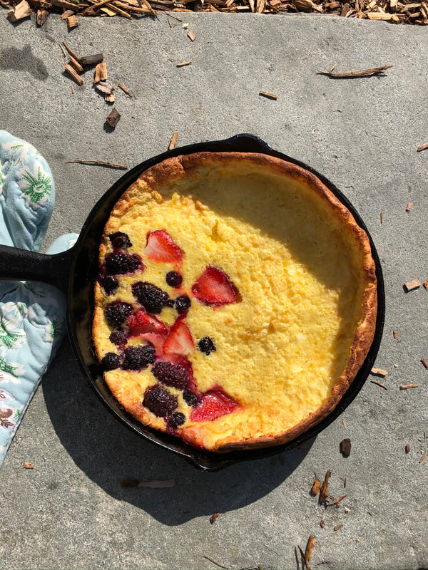 If you are feeling adventurous, a Mixed-Berry Dutch Baby is a recipe from the Food and Wine website. I recently made this for my daughter and husband has we had some very ripe berries in the refrigerator. For the Dutch baby you’ll need 3 eggs, lemon zest, flour, milk, raspberries, blackberries and butter. You can adjust the recipe for whatever berries you prefer or can locate. The Dutch baby is made in a 10-inch cast iron skillet on the stove top, but finishes by baking in the oven. It magically puffs up and is light and delicious.