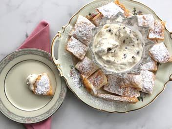 ​Using my stand mixer, the dough came together quite quickly. After kneading the dough a couple minutes, I wrapped the dough in plastic wrap and had to let it rest for an hour. After an hour, I rolled the dough out between two non-stick silicon sheets and cut out 2-inch squares, but you can make them larger. After frying the chips in corn oil, I realized I should have doubled the recipe as I have more dip than chips. When the chips came out of the frying pan, I transferred them to a dish lined with a paper towel to absorb any excess oil. After cooling, it was time to dust them with confectionery sugar. I placed the chips and dip on a pretty dish and I was ready for serving.