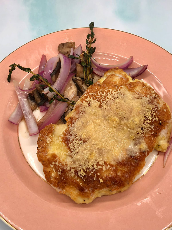 I cooked the chicken in a cast iron frying pan as I wanted to be able to put it in the oven. After browning the chicken, its transferred to a plate. In the same pan, you sauté the mushrooms, onion and herbs. On the veggies were softened the chicken goes on top and is popped into the oven to finish cooking. At this point, I added a bit more grated Parmesan cheese on top of the chicken.