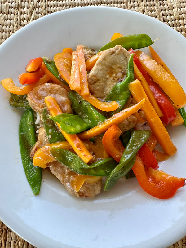 Another recipe I enjoy making, especially after a busy day, is a stir-fry meal. When Wegmans Food Store opened in our area, their flyers use to include recipes. Once such recipe was for Stir-Fry Pork with Snow Peas in a Citrus Soy Sauce. The ingredients for the stir-fry are pork tenderloin, fresh garlic, Wegmans Citrus Soy Sauce, cornstarch, fresh snow peas, fresh carrots cut into matchstick pieces, olive oil, and a red pepper. Occasionally, Wegmans may not have this product, but when they do, I purchase two. While you can find citrus soy recipes online, I have yet to attempt them. The ingredients in the Wegmans product are water, orange juice concentrate, soybeans, honey, salt, cornstarch, garlic, and small amounts of ginger, sugar, citric acid, black pepper, orange oil, and ascorbic acid. If you eliminate the soybeans, citric acid, ascorbic acid, and probably the orange oil, you could adapt a recipe with these ingredients. However, if you’re able to locate something similar, you’ll enjoy a meal that takes all of 30 minutes to prepare. I’ve made this for a number of years, and it’s quick and delicious. I serve it atop plain white rice. My husband likes to garnish his portion with Chinese mustard and soy sauce.