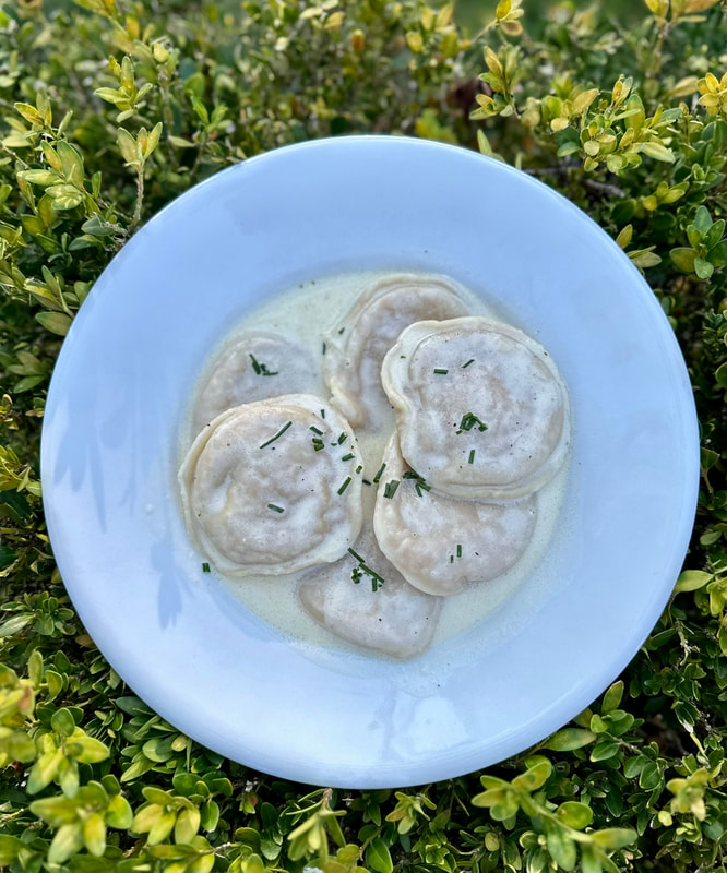 After my ravioli were cooked, I drained them and put them back into the pot. I took my white wine sauce and strained the solids through a fine mesh strainer while holding it over the ravioli. Straining the solids would make for a much nicer presentation and garnish with more herbs. My gosh, was this dish heavenly! The wine sauce was rich, creamy and infused with all the ingredients. My husband and I just loved this preparation.