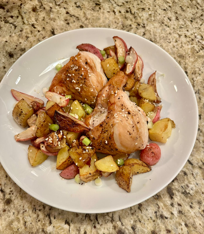 The chicken is roasted in a 450° oven for 15 minutes. While the meat roasts, the radishes are tossed with the remaining miso/butter mixture and a tablespoon of oil and seasoned with salt and pepper. When the 15 minutes of roasting time is up, the radishes are added to the sheet pan and cooked until golden and the chicken reaches an internal temperature of 165°. To serve, squeeze some lime juice over the chicken and radishes and garnish with thinly sliced scallions and sesame seeds.