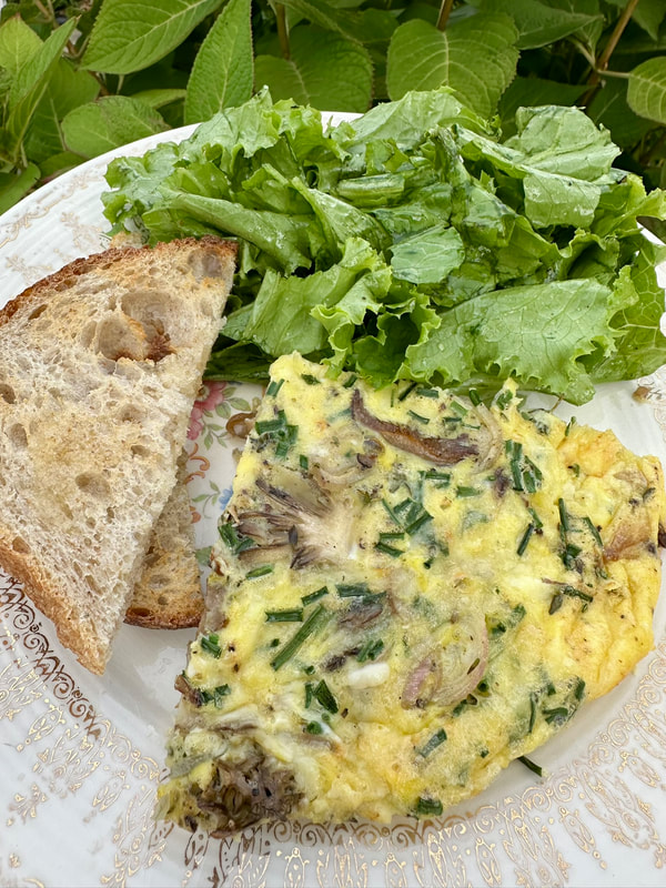 Prior to cooking, mushrooms are torn into bite-size pieces and the shallot is minced. I used a 10-inch cast iron skillet to cook the mushrooms with olive oil. They were seared on one side and stirred to sear the topside; this takes approximately 15 minutes in total. The shallots and thyme are added to the pan and cooked until the shallot is translucent. The thyme stems are removed, and the ingredients are removed and seasoned with salt and pepper. While the mushrooms were cooking, I whisked the eggs and added grated Gruyère cheese along with the chives, salt, and pepper. The mixture was added to the pan, making sure to distribute the liquid evenly among the mushrooms. The pan was transferred to the oven, where it baked for approximately 15 minutes in a 350° oven until the eggs were set, but still soft in the center. One to two minutes under the broiler sets the center and lightly browns the top; let it rest for 5 minutes before eating.