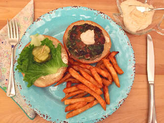 Before I went to work the other day, I quickly prepared the burgers. A quick rough chop of the spinach was needed as well as sliced scallions, salt, pepper and ground cumin. To dress the burgers, I followed one of the suggestions and made a lemon-garlic aioli.