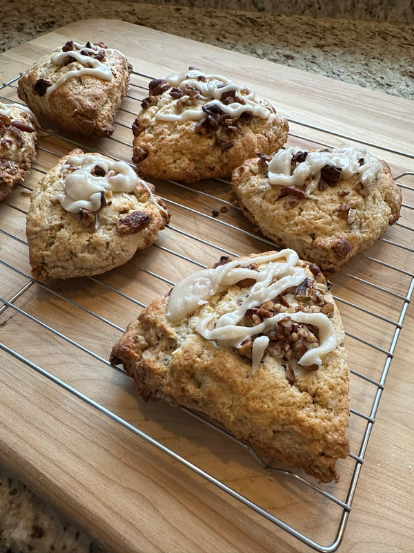 Before baking, the scone tops are brushed with 1 tablespoon of heavy cream. I placed the balance of the toasted pecans on top, using the cream as an adhesive. (The recipe calls for doing this step after icing.) Once the scones are baked and start to cool, a delicious icing is made with powdered sugar, maple syrup, heavy cream, salt and a pinch of cinnamon. The icing is drizzled over the warm scones.