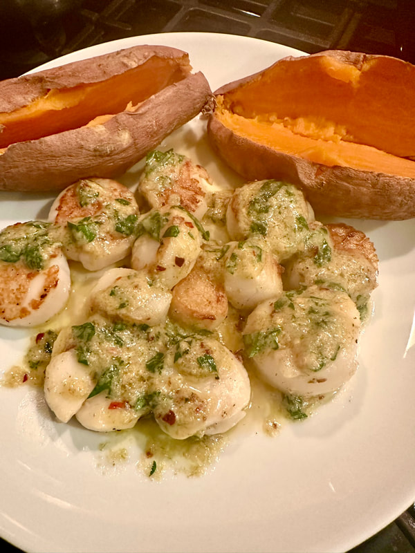 Last week the specialty food retailer, Uncle Giuseppe’s had fresh sea scallops on special for $19.99/lb. Scallop prices have remained quite high since last year, but I couldn’t resist purchasing some for dinner. I searched The New York Times cooking app and found a great recipe by David Tanis for Seared Sea Scallops with Ginger-Lime Butter. For the recipe you’ll need 12 ounces of dry-packed fresh scallops, salt, freshly ground pepper, unsalted butter, grated ginger, hot red chile pepper, the zest and juice of a lime, olive oil, baby bok choy and fresh cilantro. Also, Mr. Tanis suggested serving the scallops with roasted sweet potatoes.