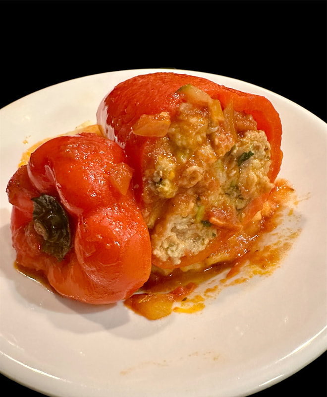 My husband loves stuffed peppers. One Sunday afternoon I caught an episode of Lidia Bastianich’s new season of “ Lidia’s Kitchen” featuring recipes from her latest cookbook “Lidia’s - From Our Family Table to Yours.” The recipe she featured this particular Sunday was Turkey Stuffed Peppers (Peperoni Ripieni di Tacchino). This recipe was particularly interesting as she used ground turkey instead of beef and incorporated shredded carrot and zucchini along with grated Grana Padano, parsley, egg, salt, freshly ground pepper and moistened day-old bread. The peppers are cooked in a tomato sauce made by sautéing onion in olive oil and using passata, water, oregano, salt and bay leaves.