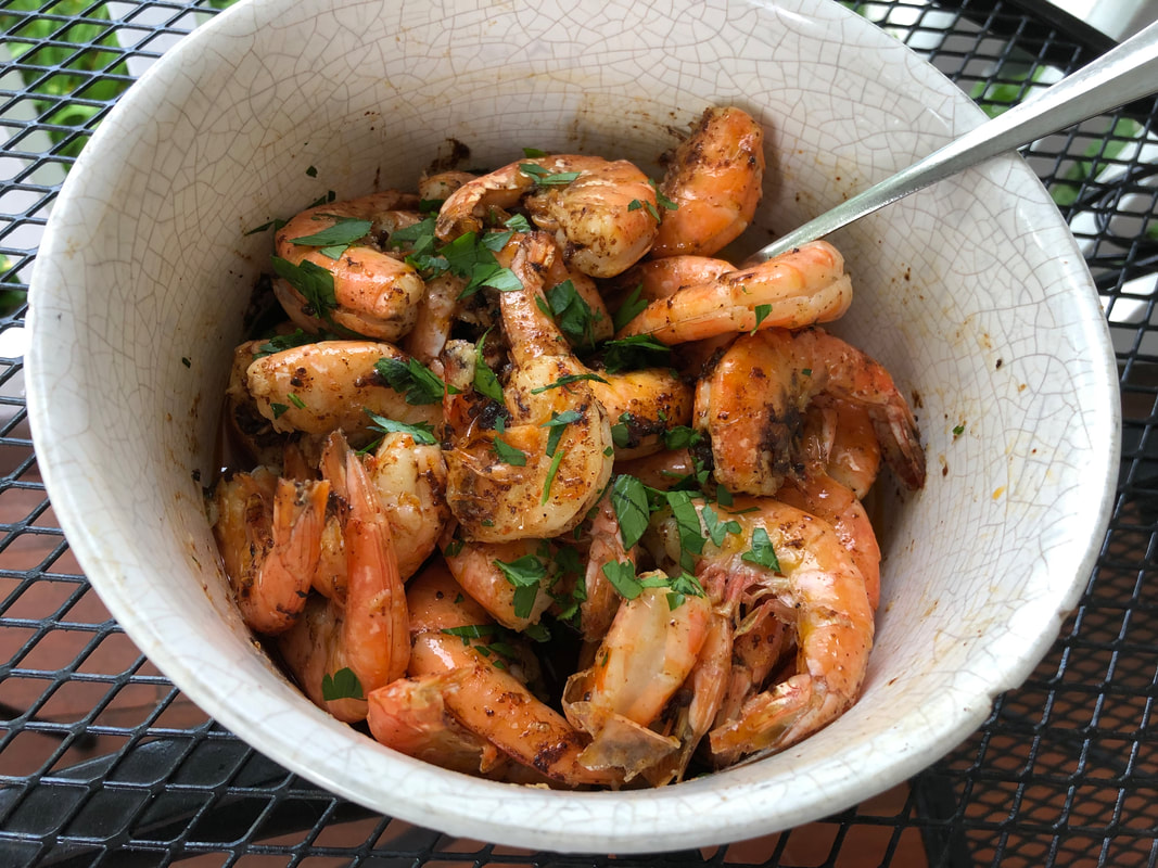To prepare the shrimp, you use a scissor to make a slit down the back of the shrimp, devein the shrimp and toss the shrimp with the oil, garlic and some salt for about 15 minutes at room temperature. The sauce that dresses the cooked shrimp is made with butter, chili powder, Worcestershire sauce and a bit of salt. The shrimp is threaded on skewers and I then grilled for approximately for 3-4 minutes, or just till they turned pink. The shrimp are removed from the skewers and tossed with the butter mixture.