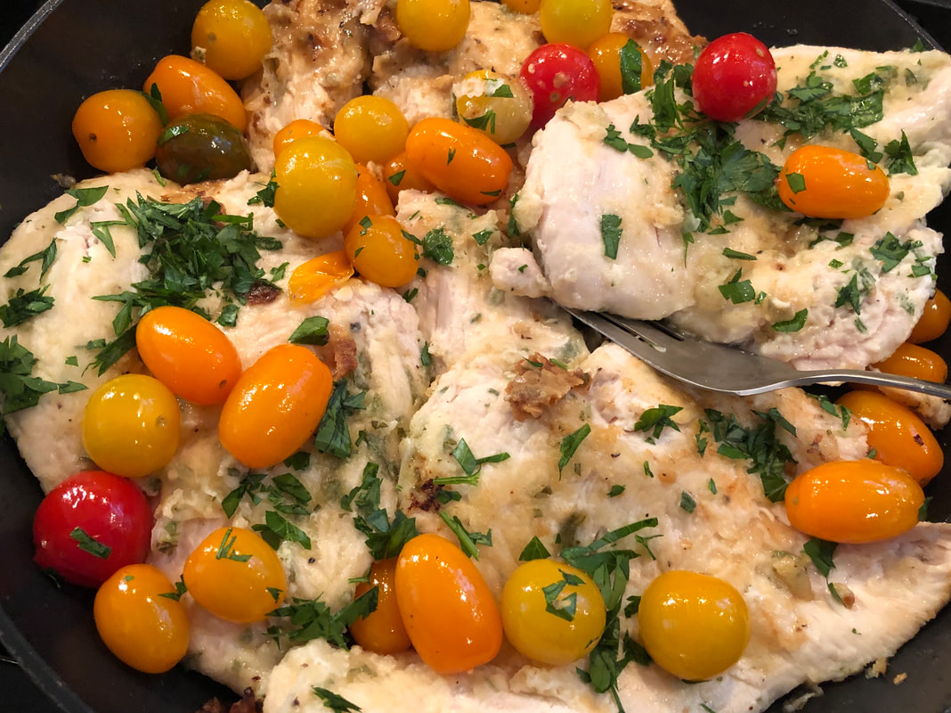My daughter and her family were here over the weekend. I wanted to prepare a new recipe so that I could share it with you, plus I wanted it to be something easy to do with a 22 month old on hand. I found on the New York Times cooking app, a recipe by Martha Rose Shulman for Lemon and Garlic Chicken with Cherry Tomatoes. This a 30 minute recipe that uses EVOO, fresh lemon juice, garlic, fresh rosemary, boneless chicken breasts, cherry tomatoes, fresh parsley and some Parmesan cheese.
