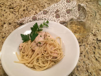 One time when I came into the shop, there was a recipe on the counter for chicken scampi. Nothing fancy and all items should be in a well stock pantry. It's a good recipe to have on hand has it takes approximately 45 minutes from start to finish to prepare this dish. I usually serve it over rice, but last night I had a small amount of spaghetti left in a box, so mixed the two together for a tasty quick supper.
