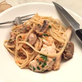 The ingredients are easy to find such as carrots, onions, mushrooms, boneless, skinless chicken breasts, spaghetti, milk, fresh parsley, breadcrumbs, chicken stock, sherry and Parmesan cheese. I think it took me about 45 minutes to prepare the dish this evening. I was a little behind in getting my pasta water going, but in about an hour I had dinner on the table tonight.