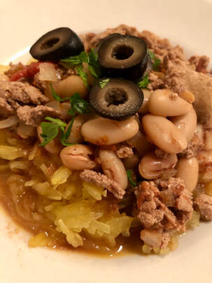 Besides the spaghetti squash you’ll need, kosher salt, extra-virgin olive oil, ground turkey, allspice, cinnamon, cayenne pepper, apple cider vinegar, an onion, chicken broth, a can of kidney beans, 14-ounce can of tomato sauce, unsweetened cocoa powder, fresh parsley and pitted olives.