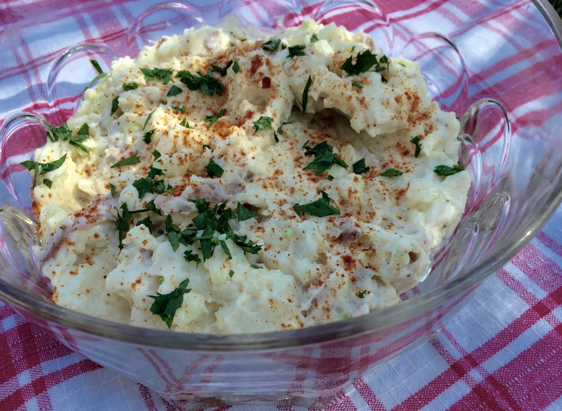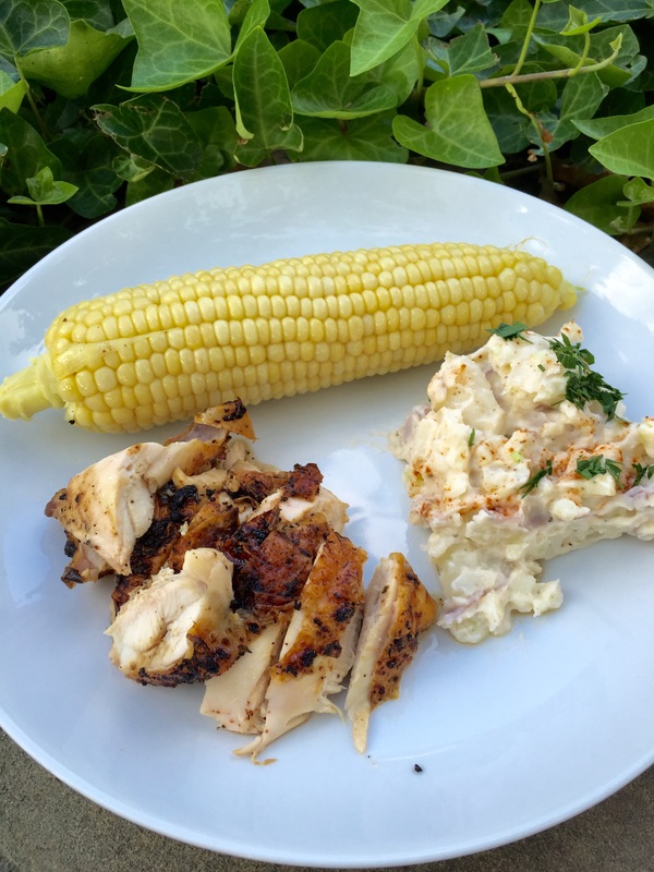 This evening's supper was rotisserie cooked chicken with Williams-Sonoma Smokehouse rub. Along with the chicken, Delicious Orchards had 6 ears of white corn for $3.49, which I purchased. Luckily I had some red-skinned potatoes (no peeling) in the basement and I was able to whip up a small batch of potato salad to go along with the chicken.