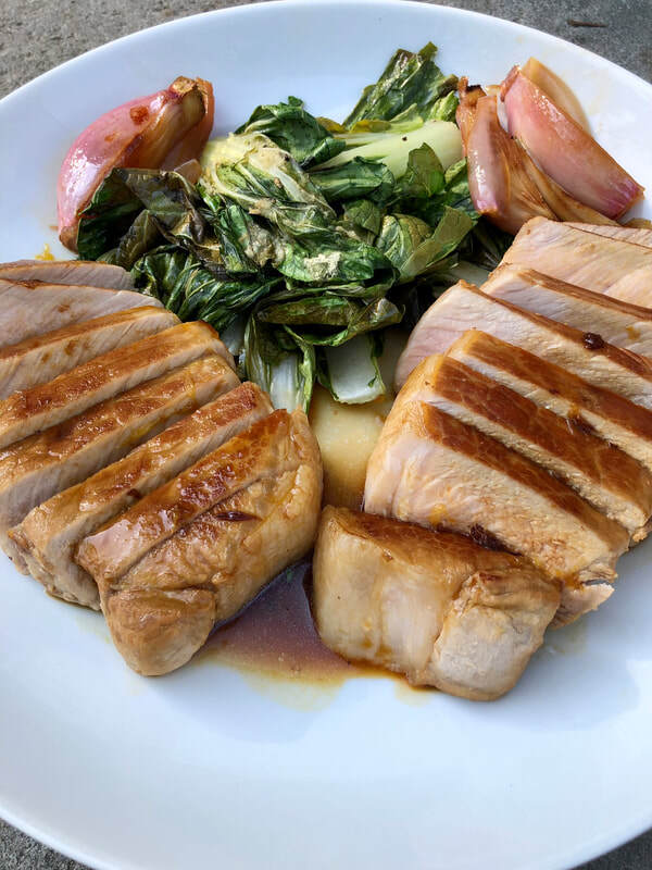 - Transfer the bok choy to the serving platter. Slice the pork and transfer to the platter along with any accumulated juices from the meat. Spoon the pan sauce and squeeze the caramelized orange halves over the top.