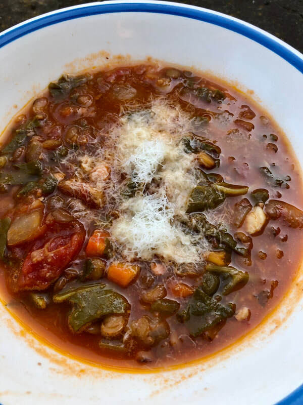 In your deli section of your local grocery store, you’ll find small 4-ounce packages of chopped pancetta. The pancetta and fresh garlic are pulsed in a food processor to make a smooth pestata (ground mixture). The pestata is cooked until fat is rendered allowing the onion, carrots and celery to cook until softened. The next four steps have you incorporating the remaining ingredients allowing cooking time after each to develop depth of flavor and thicken. The soup was packed with lots of flavor, robust from the lentils and hearty. It was the perfect meal for a cool evening; delicious.