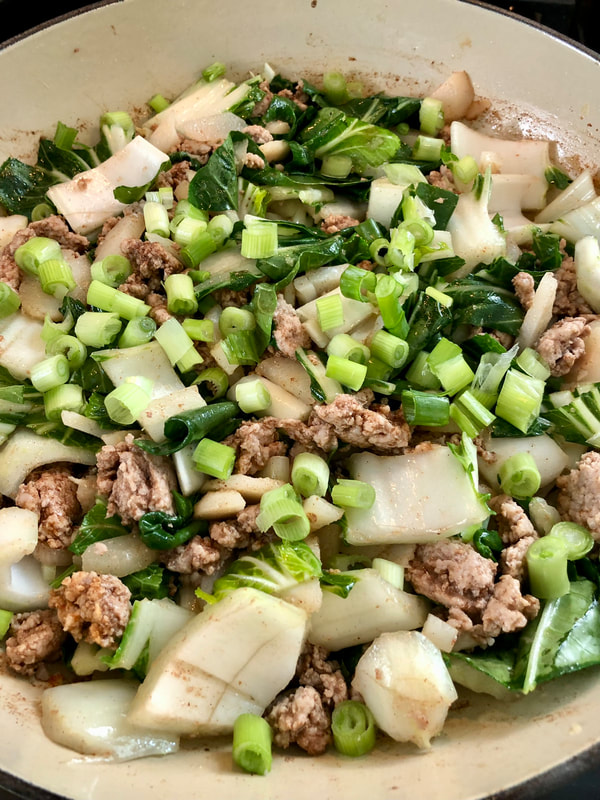 “This super speedy 15-minute ground pork stir-fry is mixed with fresh ginger, baby bok choy, scallions and Chinese Five Spice seasoning. Serve it over cauliflower rice for a paleo friendly meal, or toss with Chinese egg noodles.”