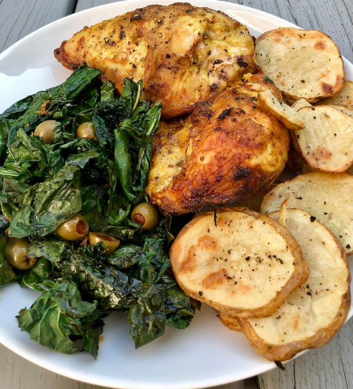In a plastic bag, olive oil, garlic, curry powder, salt, pepper and red-pepper flakes are added and the chicken tossed in. For deeper flavor, I opted to marinate the chicken overnight. The next day, I placed the chicken on a foil-lined, rimmed baking sheet and cooked in a 425° oven until the meat registered 165°. The chicken was removed to a Pyrex dish and loosely covered to keep warm. To the pan I added chopped fresh kale. I tossed the kale with the pan juices, added green olives and the pickled brine. The kale needed just five minutes in the oven.