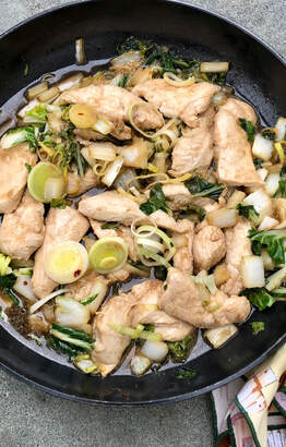 - Add the remaining peanut oil to the skillet. Add the bok choy and cook 1 minute. Stir in the leeks and chili flakes; cook, tossing frequently until bok choy and leeks are tender, about 1 minute. Stir in the marinade and a pinch of salt. Move vegetable mixture to the border of the pan. Add remaining ginger and garlic to center of pan and cook, mashing lightly, until fragrant, about 30 seconds. Return chicken to skillet and combine with ginger, garlic, and vegetables. Serve immediately, over rice.