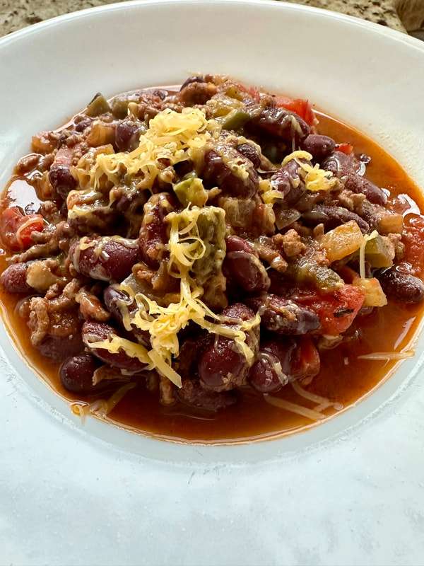 I recently found a wonderful recipe in “Southern Living Magazine” for Three-Bean Beef Chili. The recipe leans toward more beans and less beef. For the recipe, you’ll need olive oil, yellow onions, poblano chiles, ground sirloin, ancho chili powder, ground cumin, smoked paprika, kosher salt, ground coriander, dried oregano, no-salt tomato paste, fresh garlic, no salt added beans (black, pinto and dark red), fire-roasted tomatoes and water. For toppings, they suggest whole-milk yogurt, shredded cheese, cilantro leaves, sliced radishes and lime wedges. For the beef, I opted for grass-fed instead of 90/10 ground beef, which is a bit more expensive and a splurge for us.