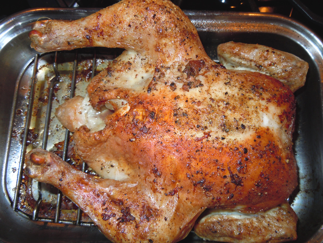 Last evening for supper I prepared the Bell & Evans Air-Chilled Whole Chickens. I roasted it in the oven seasoned with salt, pepper, onion powder, garlic powder and poultry seasoning. I melted a half of stick of butter to get a nice golden skin. Using the convection oven setting on my stove, the small chicken was done in about an hour.