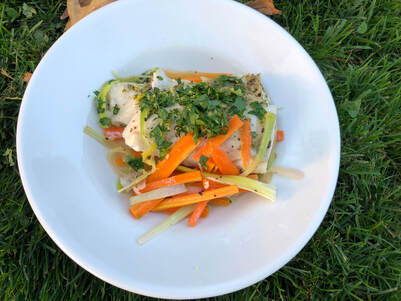 The dish was light and delectable. The carrot and leek combination gave a hint of sweetness and once cooked, a flavorful jus was created by the vegetables and dry vermouth. My husband and I thoroughly enjoyed this meal. Cod is my husband’s favorite type of fish and he loved this preparation. He did request that the next time I make this dish, that he would like it served over smashed potatoes or whipped sweet potatoes.