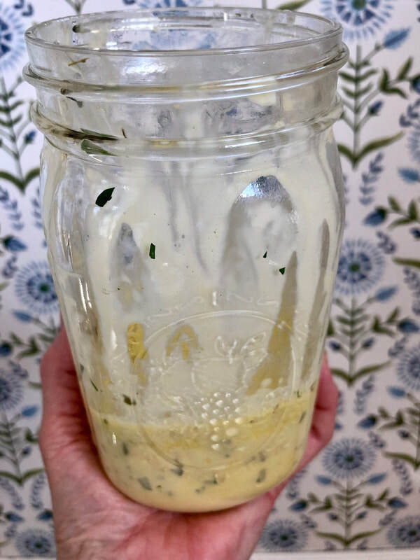 The liquids are infused with flavor with the herb stems, shallots and black peppercorns. Unfortunately, I couldn’t locate fresh tarragon or chervil in my local food stores nor did they carry dried chervil. I opted to use approximately 2 teaspoons of dried tarragon leaves. These ingredients simmer for about 25 minutes or until reduced to about 1-1/2 tablespoons. The solids are strained out leaving just the liquid. Using a 1-quart mason jar and an immersion blender, the wine reduction, egg yolks, and a pinch of salt are combined. Next, the melted butter is slowly added to the jar with the blender on to create an emulsion of the egg yolk and liquid. The sauce became thick and creamy; I adjusted the seasoning with salt and pepper, a dash more tarragon and chopped fresh parsley. Since béarnaise cannot be cooled then reheated, I placed the mason jar in a saucepan with warm water using the simmering setting on my stovetop. I stirred it occasionally and checked it frequently to make sure it remained a thick sauce.