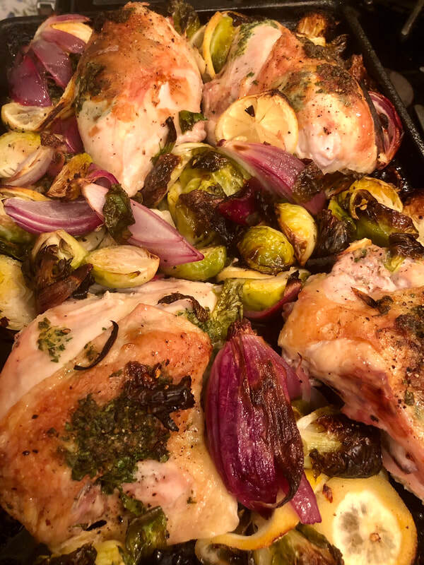 This recipe is a sheet pan meal taking approximately one hour from start to finish. First, an herbed butter is made that will be spread both under and on top of the skin. The butter is made with lemon zest, parsley and salt. For the accompanying Brussels sprouts, they are halved and mixed with onion wedges, lemon rounds, olive oil, salt, pepper and some of the herbed butter. The chicken is placed on a sheet pan and the Brussels sprouts surround the chicken. The meal is roasted for approximately 30-35 minutes.