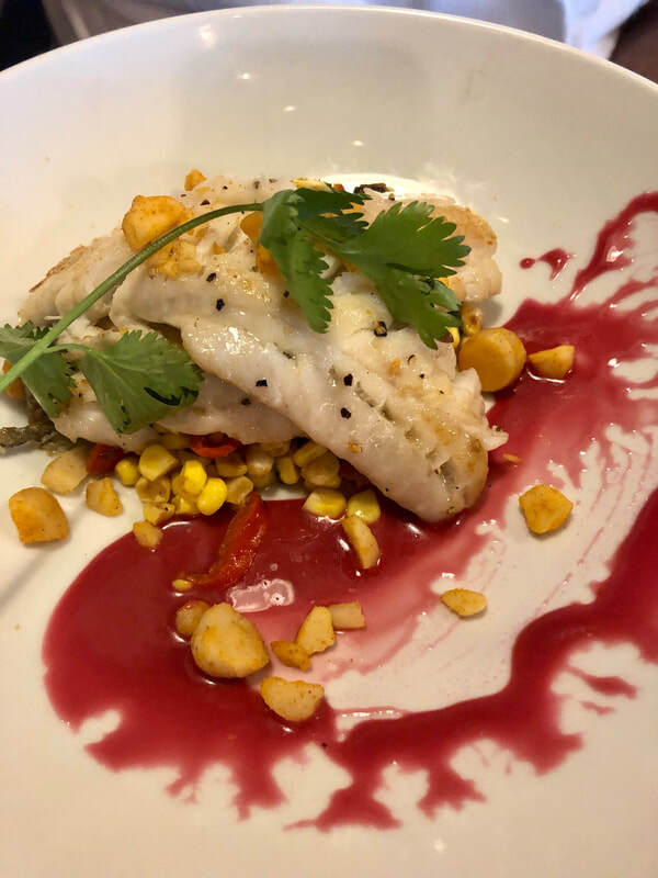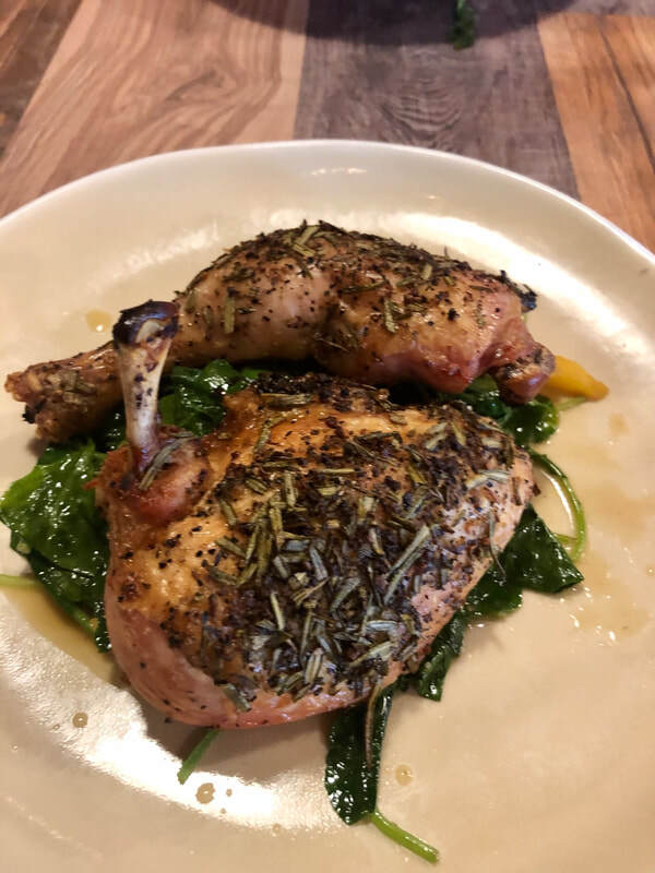 We were presented with a small glass jar filled with short and slender grissini. The were tips were nestled in a small amount of mustard oil which was spicy and delicious. Our server, Ivan, was gracious and gave us a warm welcome. Upon settling on drinks (Arnold Palmer with Asbury Park Distilling Co. Bourbon/Asbury Park, NJ and a iced tea lightly sweetened with simple syrup) it was time to peruse the menu. There was one appetizer and one main course special. Unfortunately, I can’t recall the appetizer, but my husband selected the dinner special, sea bass served Jersey corn and potatoes with a raspberry gastrique. I selected the roasted half chicken with rosemary served with peach and kale sauté.