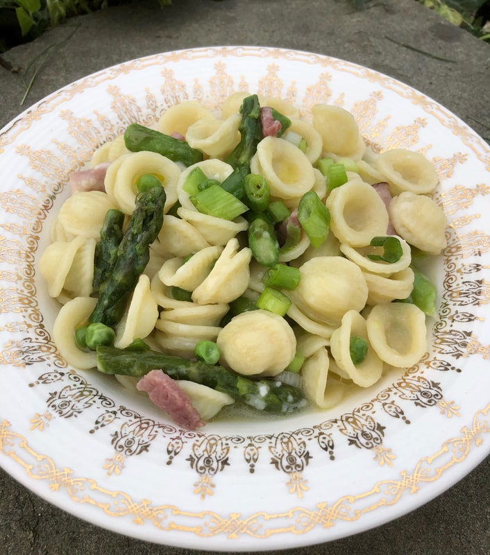It’s asparagus season and prices have been very reasonable. Last week, I was listening to a radio interview when the guest mentioned how he was preparing asparagus. That prompted me to find a recipe for supper. At the website lidiasitaly.com, I found Orecchiette with Asparagus and Peas. Fortunately, I had orecchiette in my pantry and just purchased the asparagus. You’ll also need extra-virgin olive oil, kosher salt, fresh garlic cloves, frozen or fresh peas, scallions fresh Italian parsley and grated Grana Padano or Parmesan cheese. I also had in my freezer some smoked ham left from Easter that I cubed to add to the dish. Lidia suggests adding sautéed shrimp or lobster meat for a heartier meal.