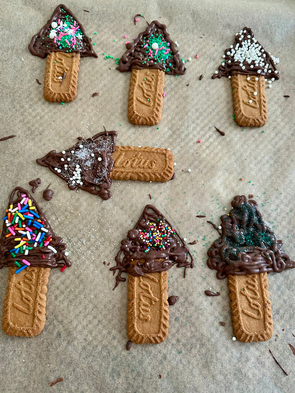 The Biscoff cookies are placed on a parchment or silicone pad lined cookie sheet. Using a piping bag, or plastic food bag with the corner snipped, the chocolate is piped to form a triangle tree shape over part of the cookie.