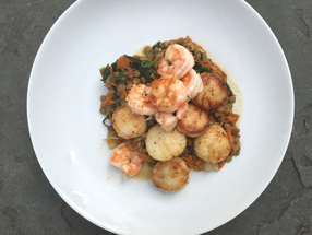 As Wegmans has bulk section of nuts, grains and legumes, I purchased green lentils there. I cooked two cups of raw lentils in four cups of water.The lentils doubled in quantity when cooking; I only need two cups cooked. For the scallops, I tossed them in Wegmans basting flour and when cooking, I seasoned both them and the shrimp with salt and pepper.