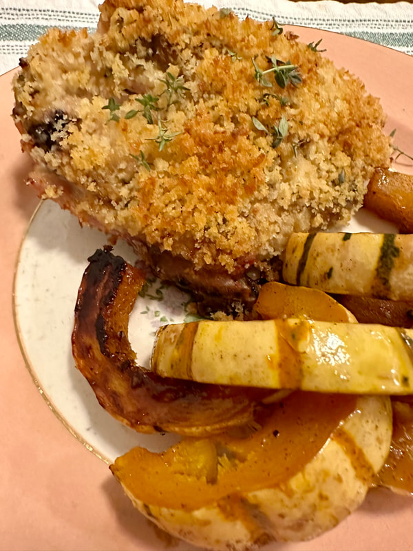 What a scrumptious meal, the pork was tender and quite flavorful, though my husband said it was a tad overdone. Perhaps I browned it too long on the stovetop or cooked it too long in the hot oven. Next time, I will use a meat thermometer to temp the meat so I have a better idea of how much time it needs to roast. The apple in combination with the raisins and craisins gave it a sweet and tart flavor, with the red wine adding a nice complexity to the overall taste. This recipe is worthy of another try.